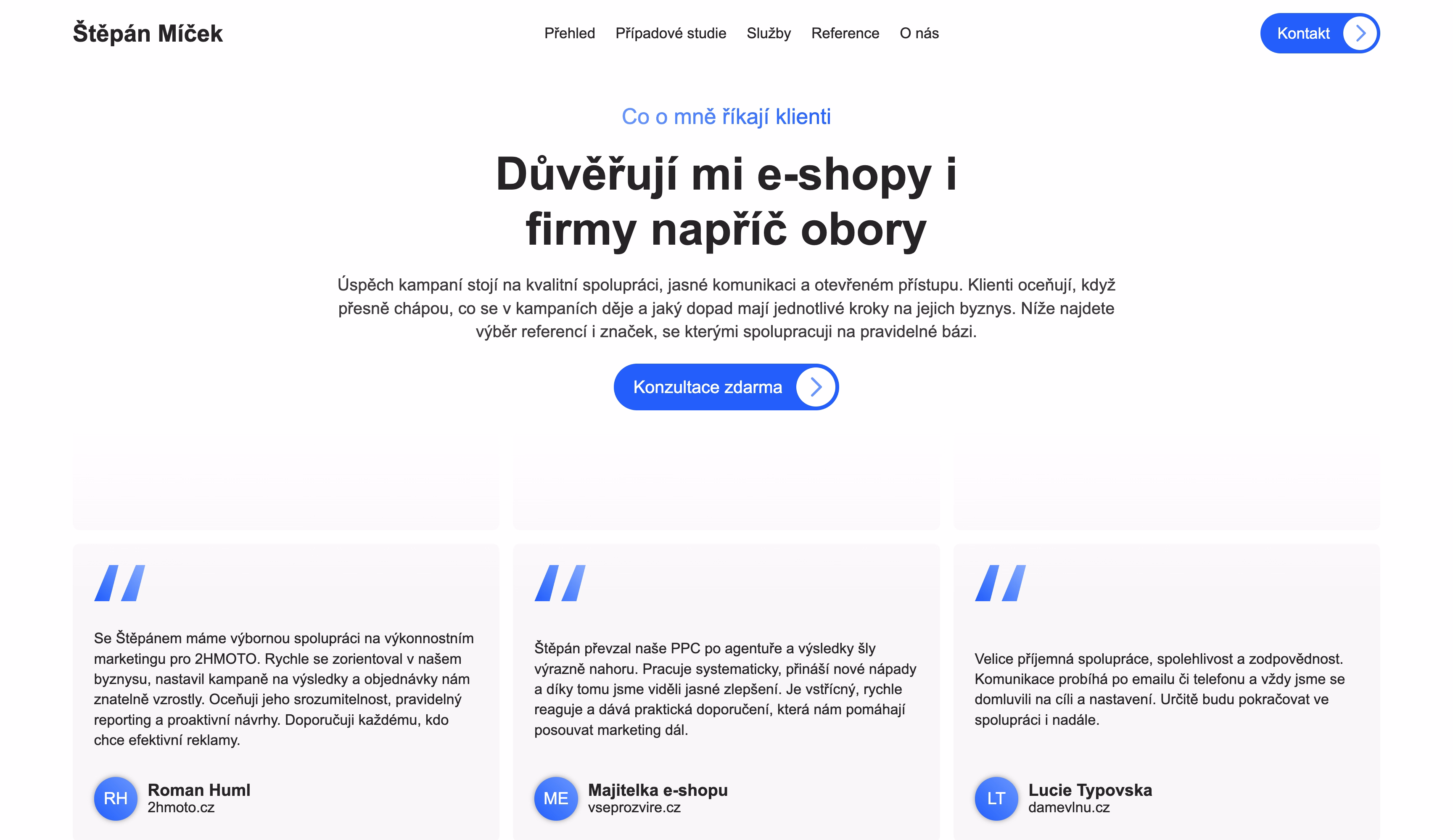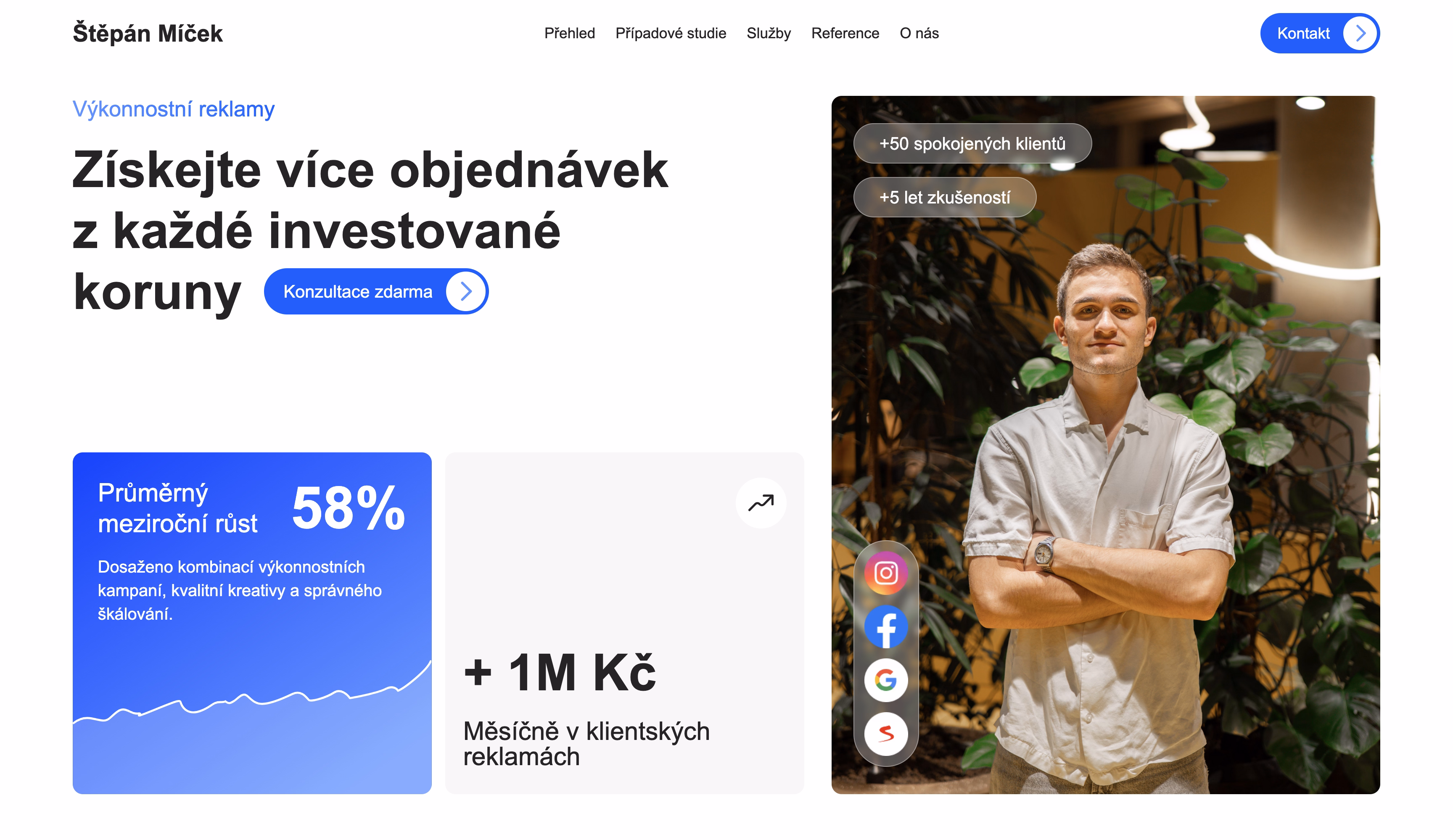 Cílem redesignu nebylo jen vizuální oživení, ale kompletní transformace webu na výkonný obchodní nástroj. Pro PPC specialistu Štěpána Míčka jsme vytvořili intuitivní a vizuálně čisté prostředí, které okamžitě buduje důvěru a podtrhuje jeho expertízu. Každý prvek na stránce má svůj strategický smysl od struktury obsahu až po psychologii prodeje. Tento přístup přinesl okamžitý nárůst poptávek a skvělé reakce klientů.